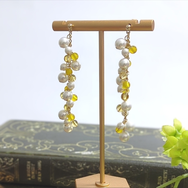 ミモザをイメージしたシトリンとイエロージェードと樹脂パールが揺れるピアス(イヤリング変更可)
