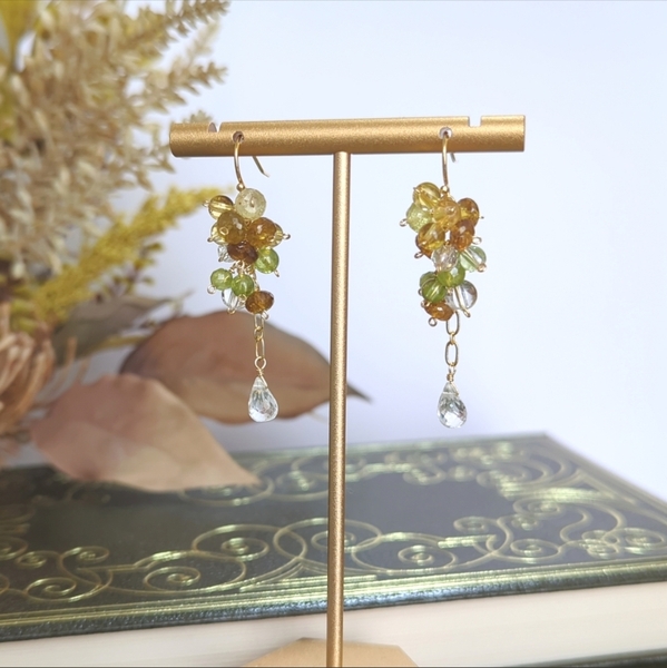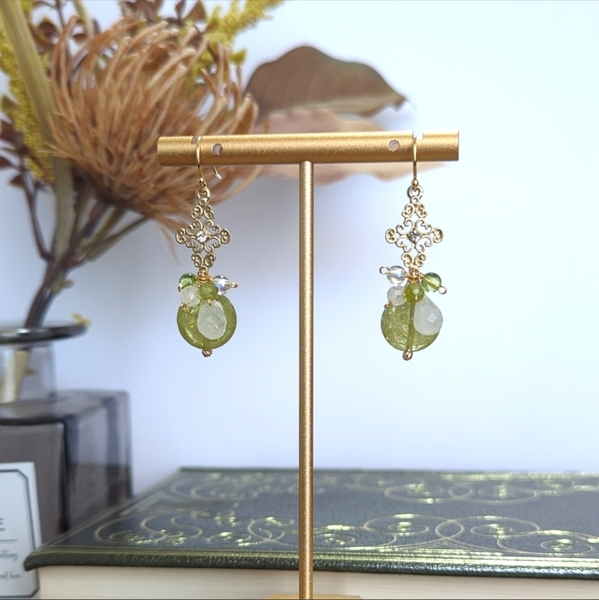 ティアドロップビーズと鈴丸ビーズが煌めくグリーンガーネットのピアス(イヤリング変更可)