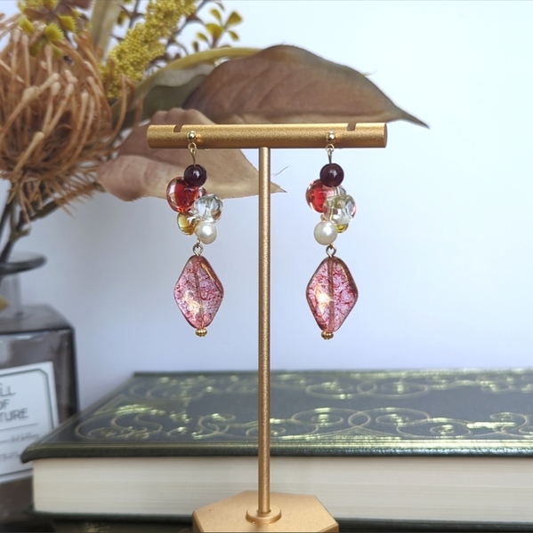 ガーネットと2種類のドロップビーズの秋色ピアス(イヤリング変更可)