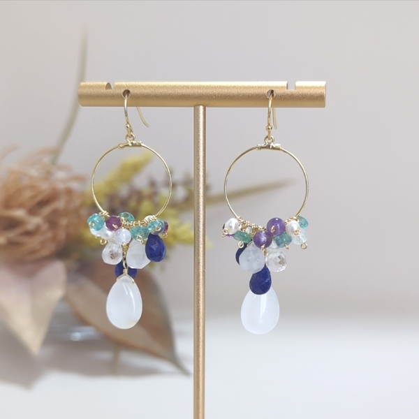 ホワイトジェードのドロップとブルー系天然石で彩るシャンデリア風ピアス(イヤリング変更可)