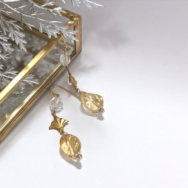 グラデーションが素敵なシトリンツイストカットとヴィンテージスタンピングコネクターのクラシカルなピアス(イヤリング変更可)