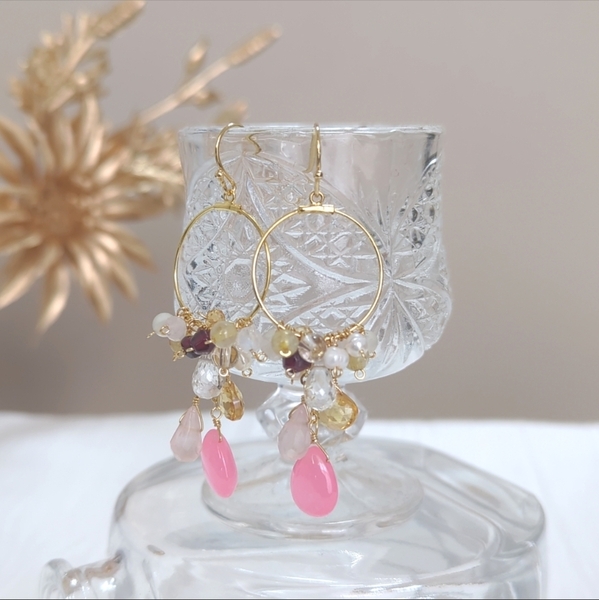 ピンクジェードのドロップと暖色系天然石で彩るシャンデリア風ピアス(イヤリング変更可)