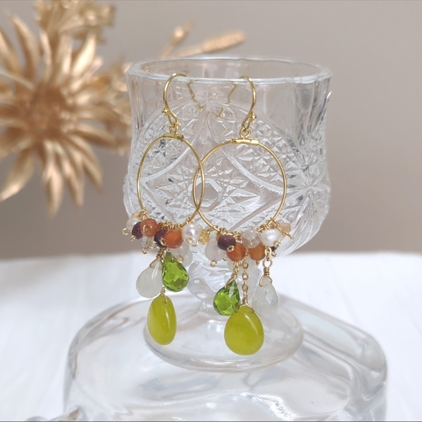 イエローグリーンジェードのドロップとグリーン&レッド系天然石で彩るシャンデリア風ピアス(イヤリング変更可)