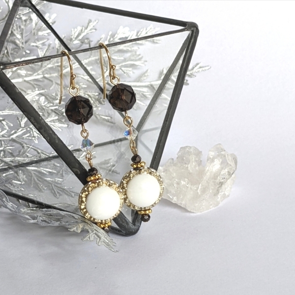 彫り細工が施されたホワイトビーズがクラシカルなピアス(イヤリング変更可)