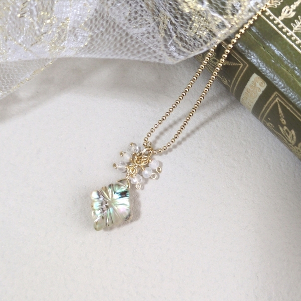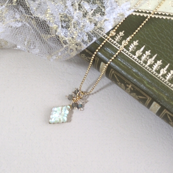 カービング彫刻が施されたアバロンシェルネックレス(ホワイトラブラドライト)