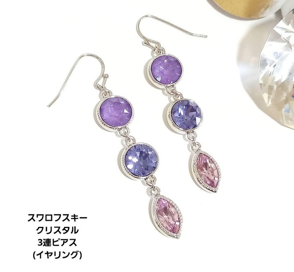 美しく上品な輝き◆藤色スワロフスキークリスタルの3連ピアス/イヤリング