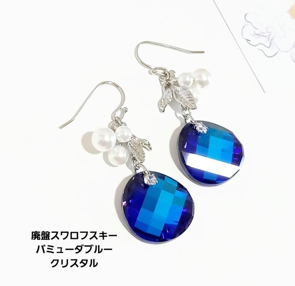 宝石の輝き◆廃盤特注スワロフスキーバミューダブルーとリーフのピアス/イヤリング