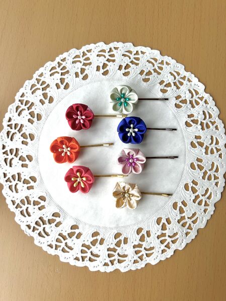 色や柄・質感の異なる着物地を使用した、個性豊かで色とりどりなつまみ細工。