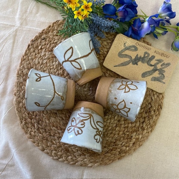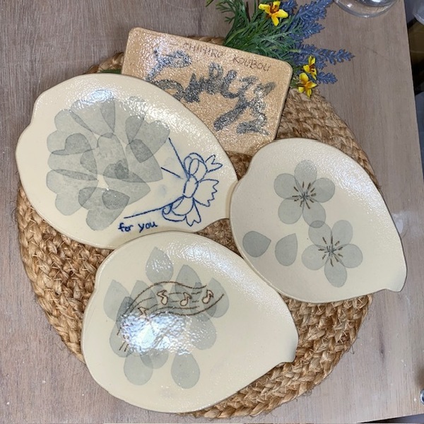ろくろ引き、手びねりでひとつひとつ丁寧に作陶している器は、土のぬくもりを感じられるよう、手馴染みを大事に作っています。和紙染め、手描き呉須、掻き落としの作風で、下書きなしのすべてが手描きのため、世界に一つだけの器です。