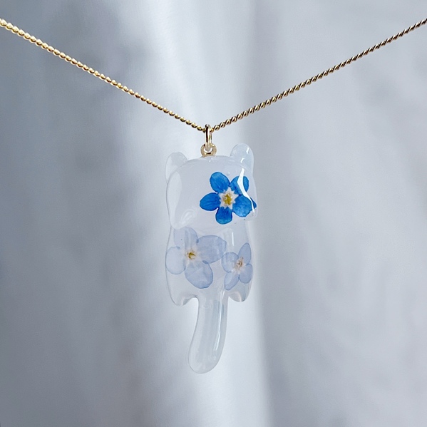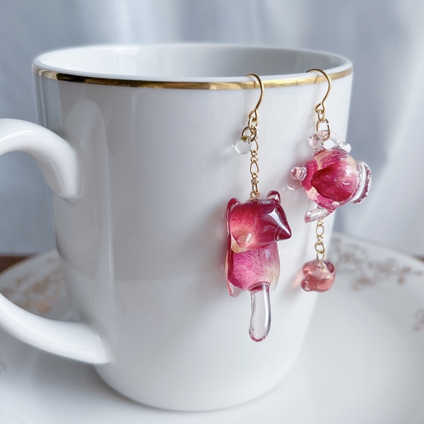 本物のお花の彩りを優しくそっとレジンの中に閉じ込めました。モチーフの中身を覗くと、さまざまなお花の表情をお楽しみいただけます。