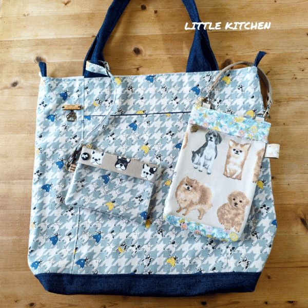 わんこ柄のバッグ、ICカードポーチ、スマフォポーチ