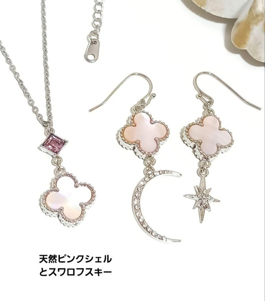美しい煌めき◆天然ピンクシェルのクローバーとスワロフスキーのアクセサリーセット