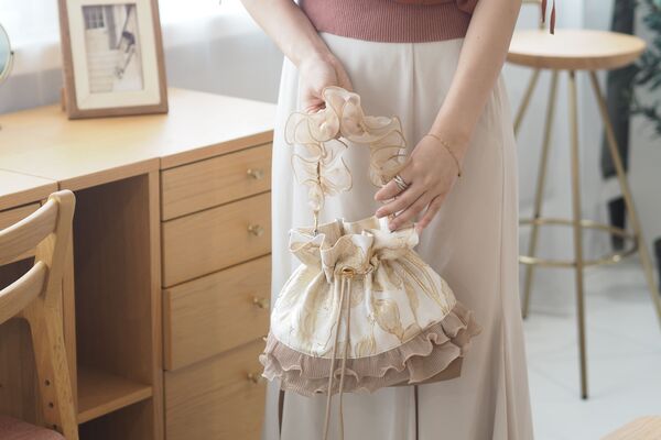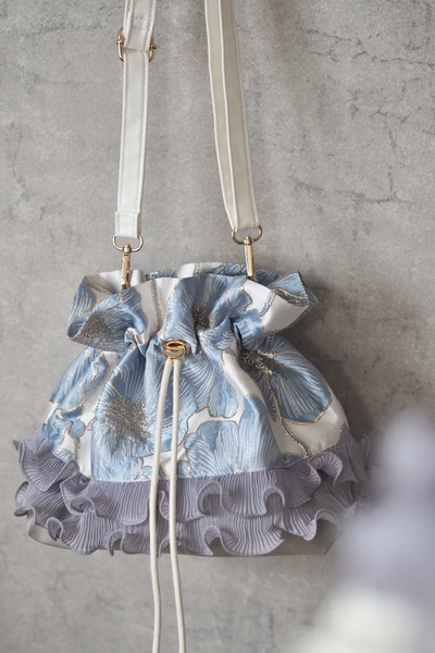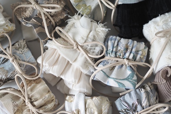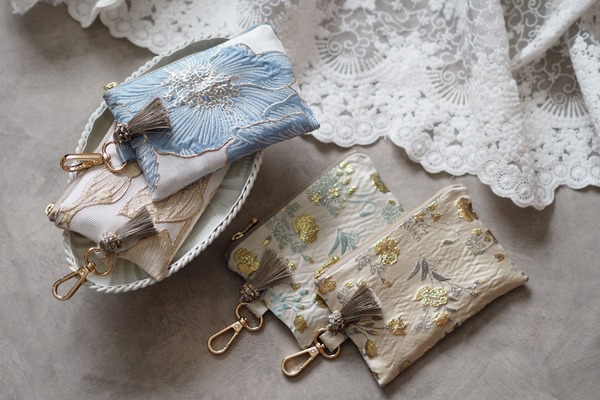金糸を使ったジャガード生地で巾着バッグやポーチなどをお作りしています。