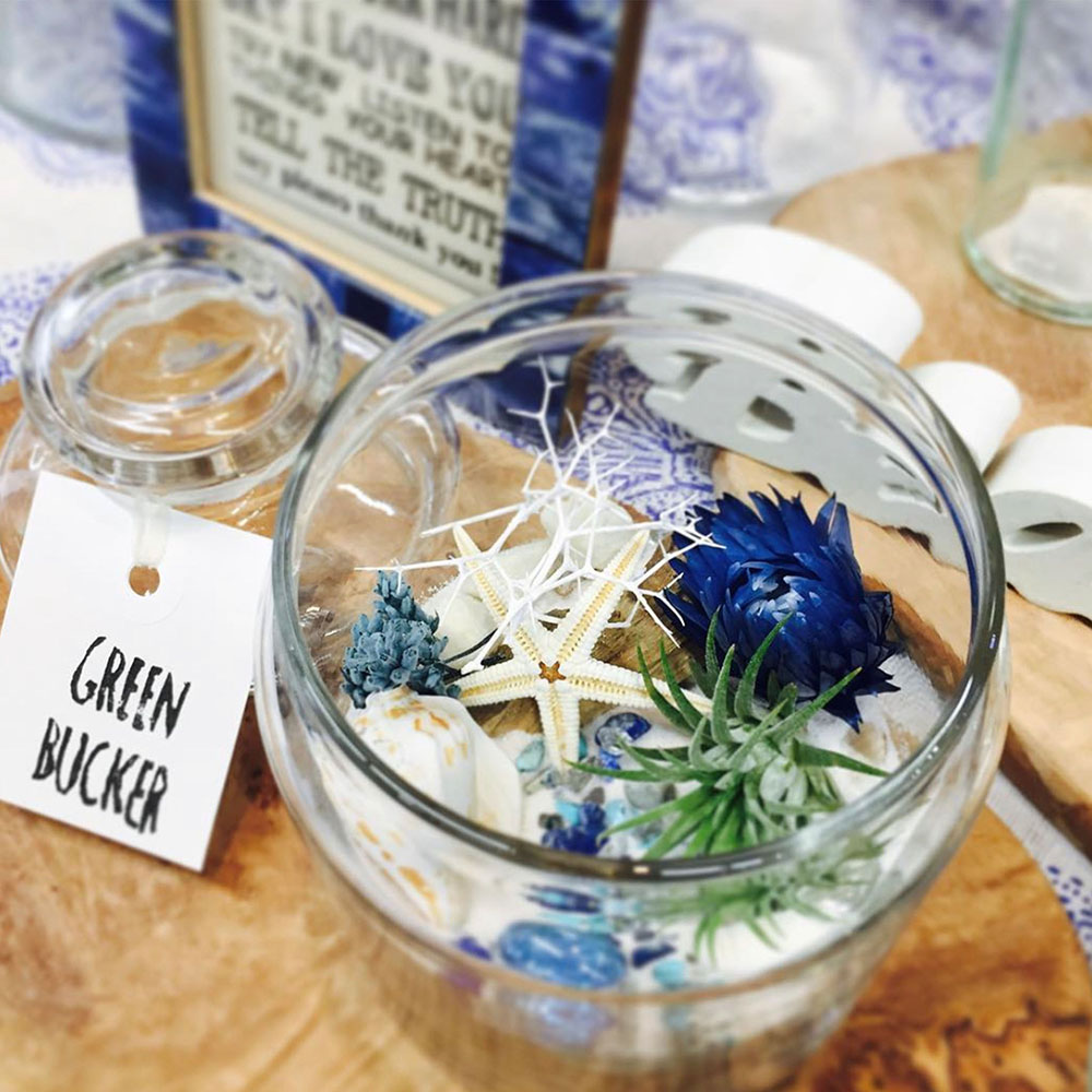 ドライフラワーや木の実、夏らしい貝殻などをガラスの瓶の中に詰めて世界にひとつのテラリウムをつくります。