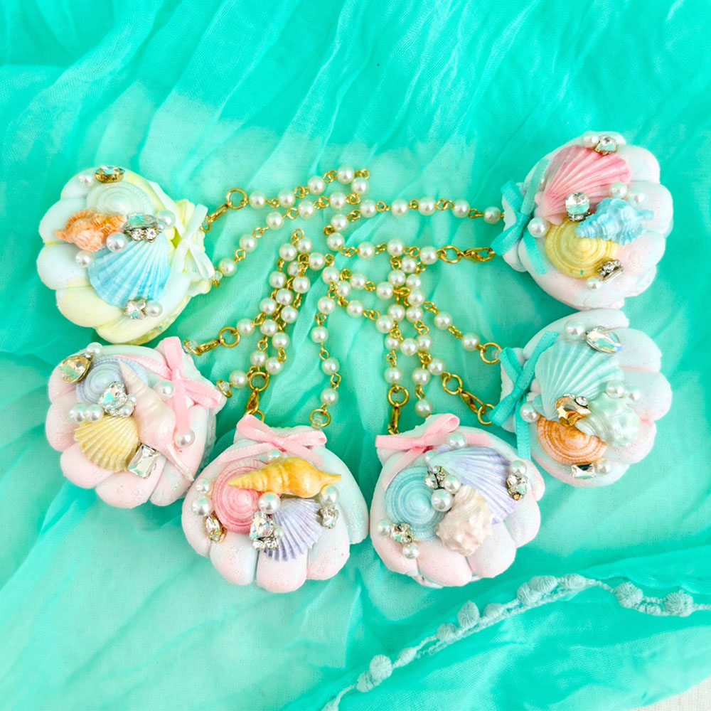 貝殻の形をしたオリジナルマカロン土台に、キラキラビジューやリボン、パールがかった貝殻をデコレーション!宝石のような貝殻マカロンのバックチャームが完成です!