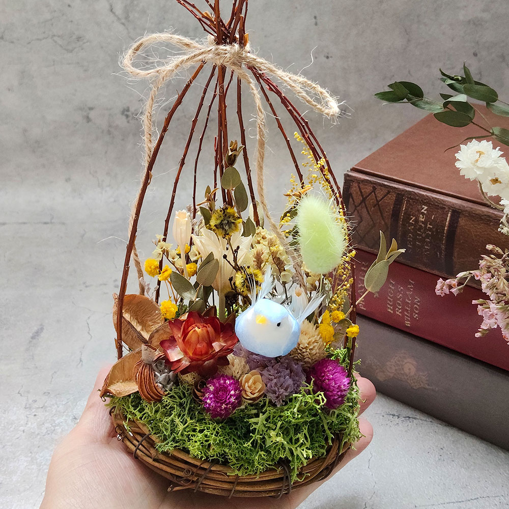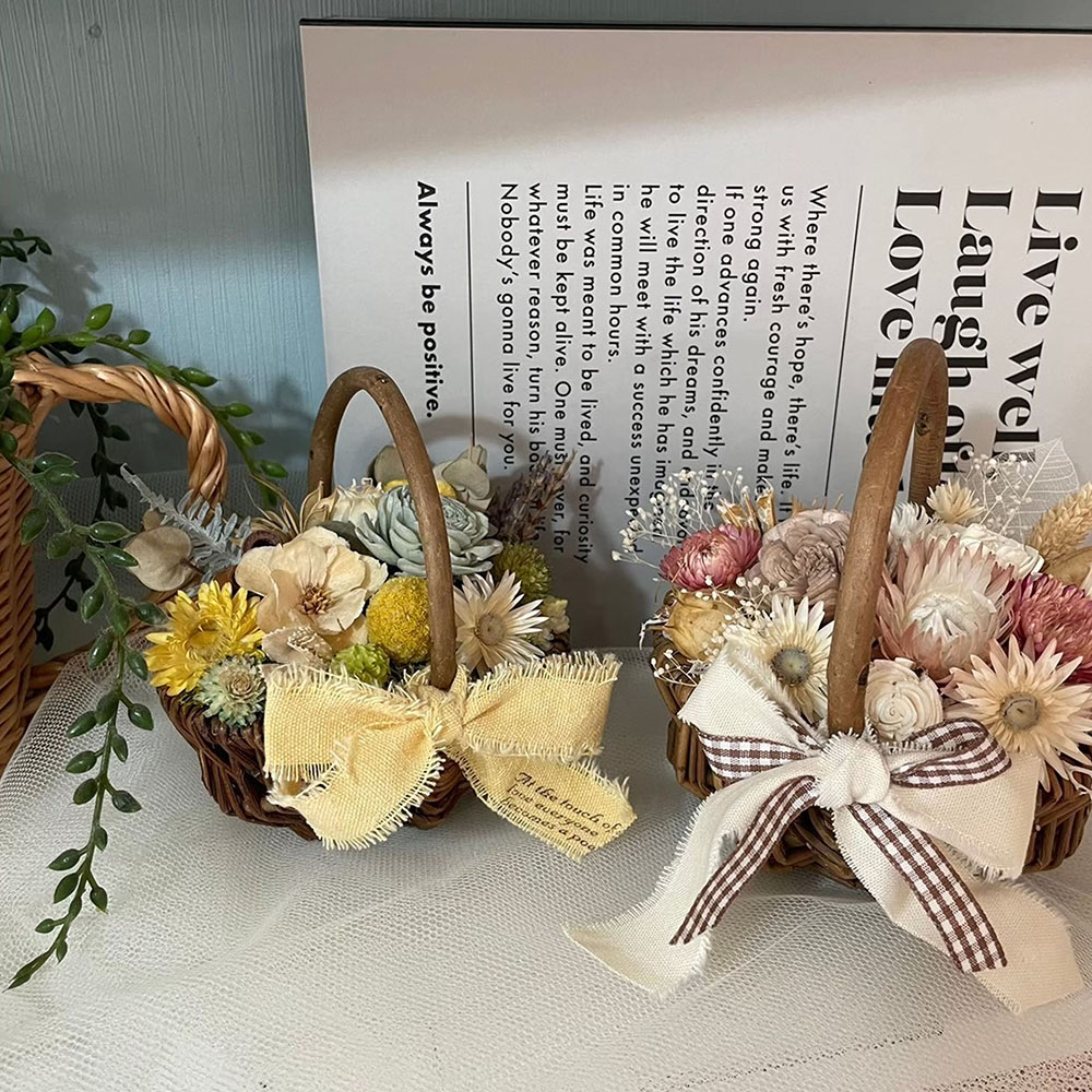 ミニバスケットいっぱいにドライフラワーを使用し、アレンジをします。可愛いリボンを添えて華やかに仕上げましょう♪お部屋のインテリアや大切な方へのプレゼントにもおすすめです。