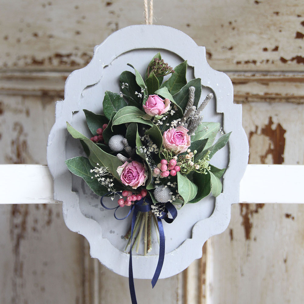 グレーのウェイブフレームに、鮮やかなドライフラワーを花束のようにあしらったフレームアレンジを作ります。バラやペッパーベリー、かすみ草などを楽しく付けて仕上げていただきます。完成サイズは約15cm×20cm(麻ひも含まず)