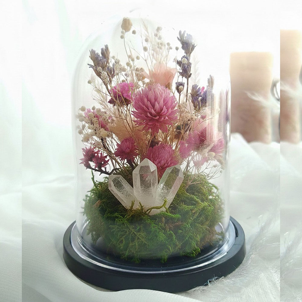 カラフルなお花と天然石の原石で、世界にひとつだけのフラワードームです。石言葉付きの天然石を選んで、お花の配置や雰囲気を楽しみましょう。お子さまから大人の方まで楽しめます。