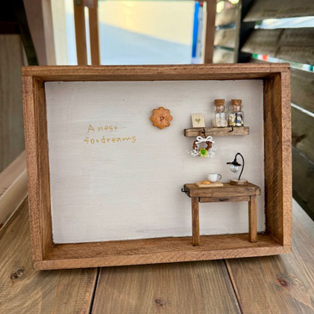 カット済の木材に好きな色を塗って組み立て、ちいさなパンやカップなどの小物を飾って「わたしのお部屋」を作りましょう。完成後はディスプレイBOXとして壁に飾れます。