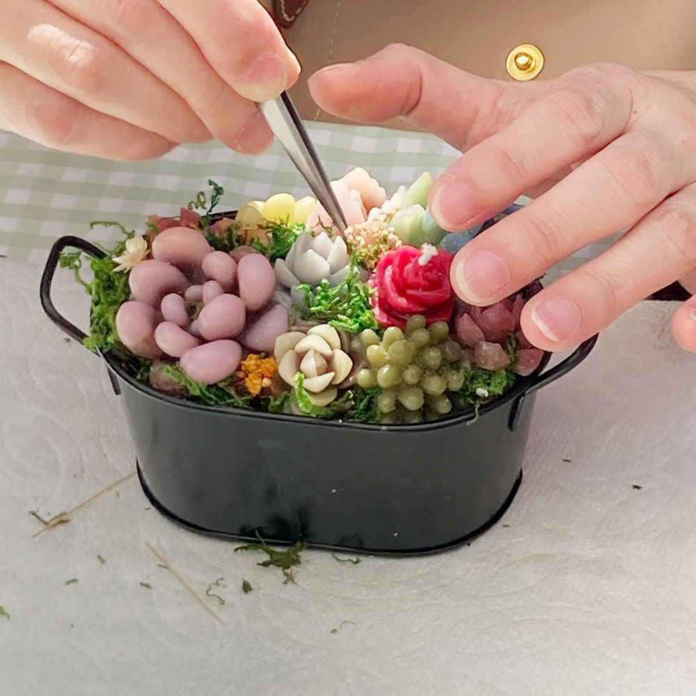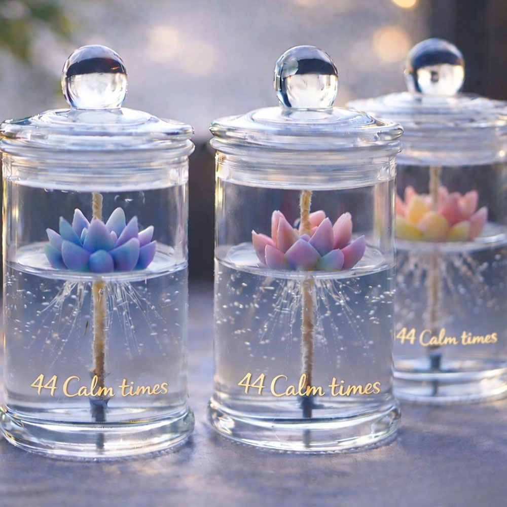 透明ジェルの中に多肉を咲かせて、キラキラ輝く水耕栽培風キャンドルを作ります。
