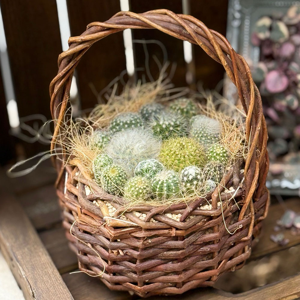 ナチュラルな手のひらサイズのラタンバスケットに、可愛い『ころもけ®︎』サボテンを寄せ植えして、あなただけの小さなグリーンバスケットを仕上げましょう!