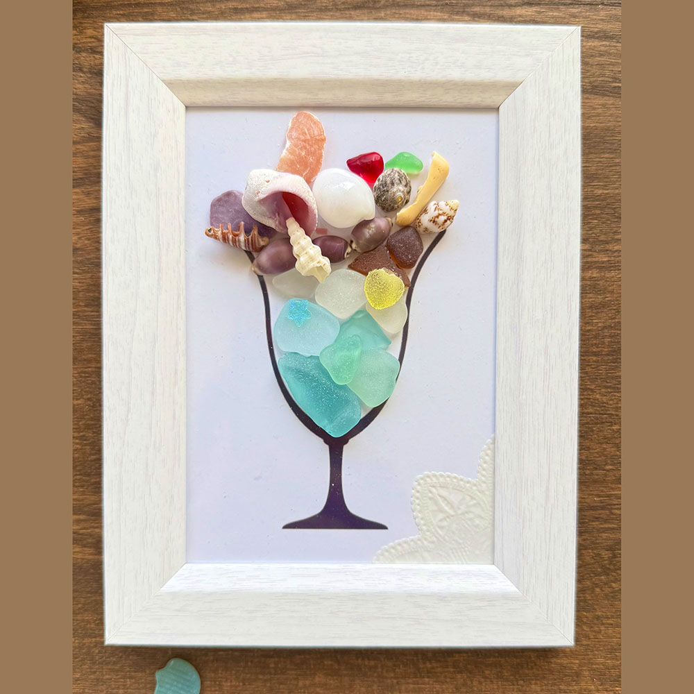 シーグラスや貝殻を使って、海のパフェアートを作ります。パフェグラスのカードに海の宝物をトッピングして、自分だけの海パフェを完成させよう!キラキラ光るシーグラスが楽しいアート体験です。