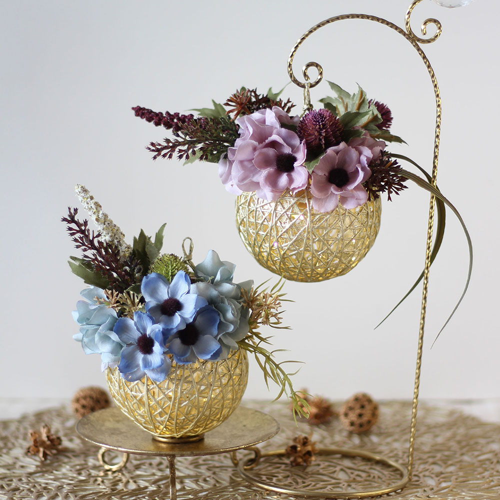 和紙の紐で作ったゴールドのランタンにアンティークカラーのアーティフィシャルフラワーを自由にアレンジして作ります。LEDライト付き。見ているだけで笑顔になり、心が温まる そんな優しいあかりを作りませんか?
